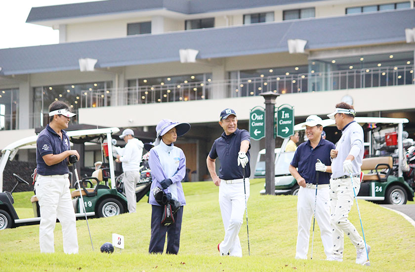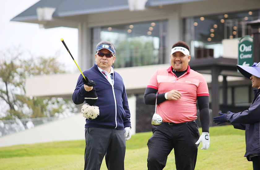 いいじゃありませんか! そんな時に助け合えるのがダブルスゴルフのいいところ。皆さん、楽しく賑やかにスタートしていきました。行ってらっしゃい!