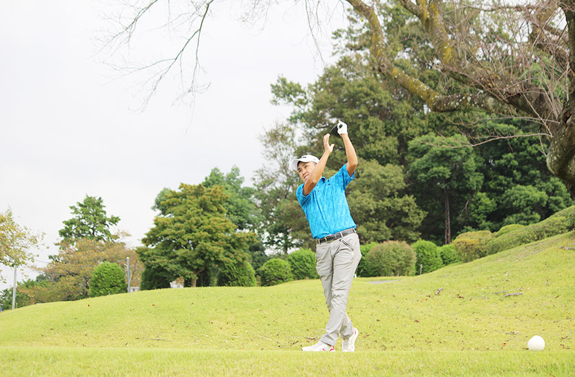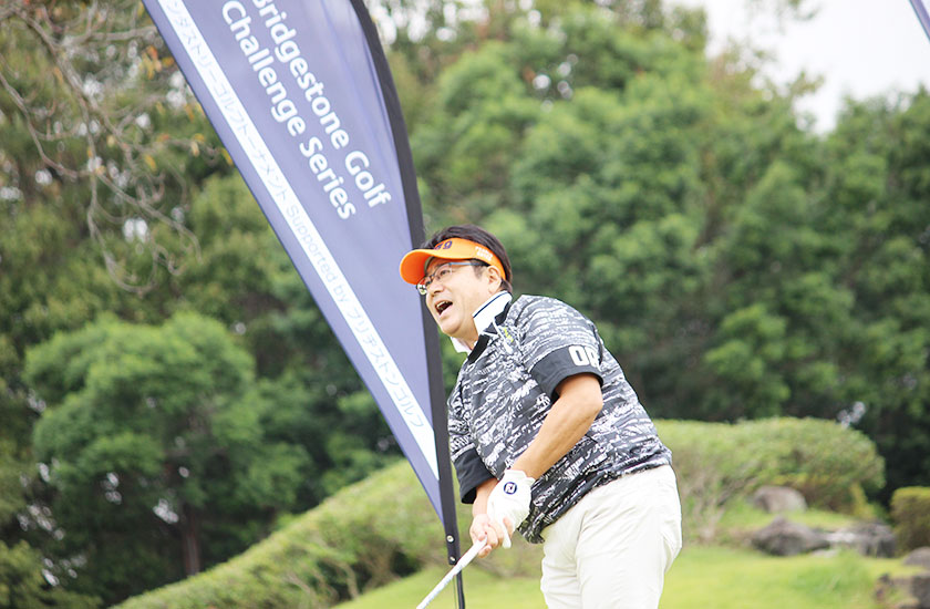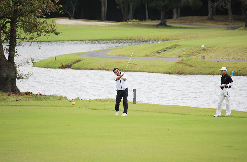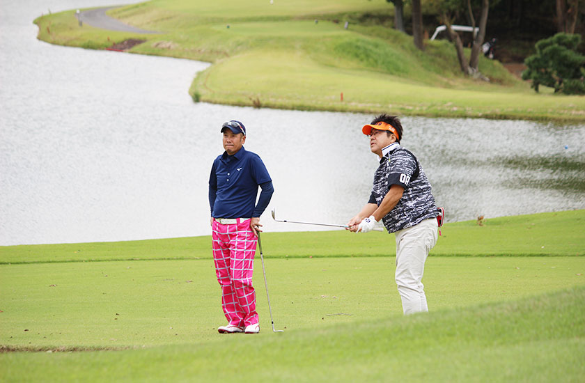 さて、この最終ホール、ここまで飛ばしてきたペアはこれまでいませんでした。池の手前ギリギリからのセカンドショットを放つのは藤林一之選手と小木曽剛選手の「MMC ゴルフ部OB」のペア。