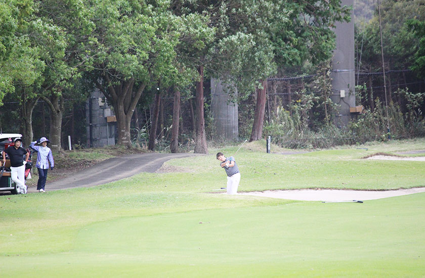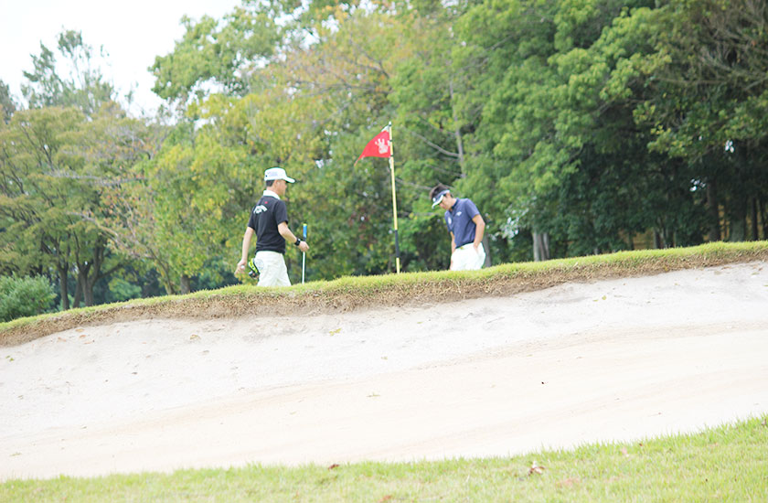 同組、才田裕一選手と満吉康輔選手のペア「ヴァルハラ」は手前のバンカーからやや苦戦の様子。