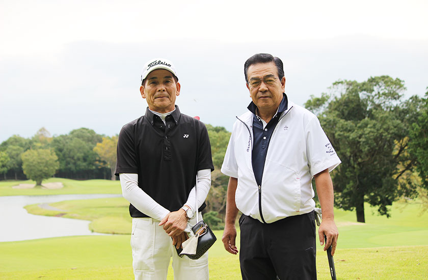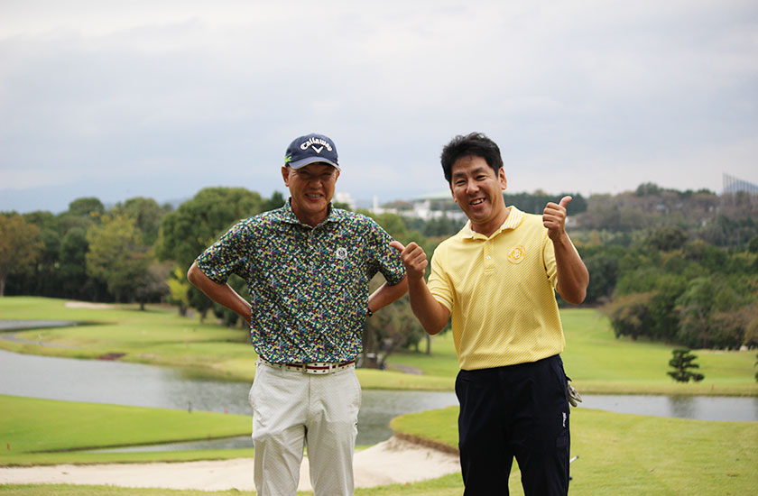 中西義男選手と吉沢勇次選手の「YYスターズ」。いぶし銀のゴルフで難コースを巧みにプレー。「優勝です!“一応”ね(笑)」と、まんざらでもない様子でホールアウト。後続を待ちます。