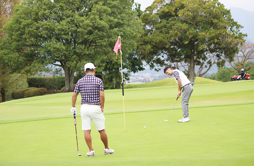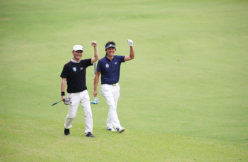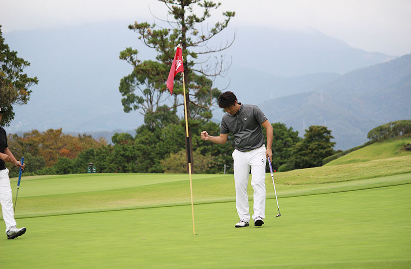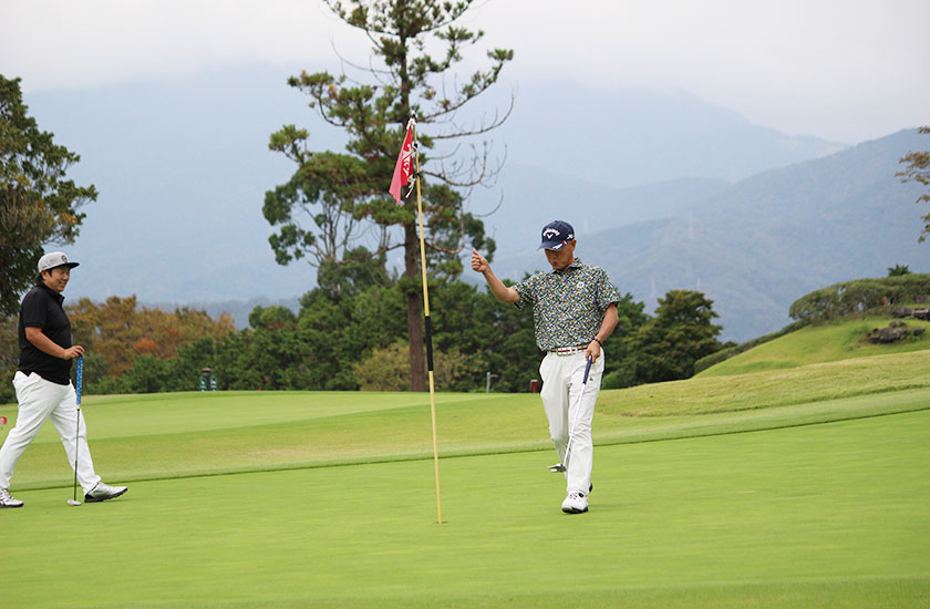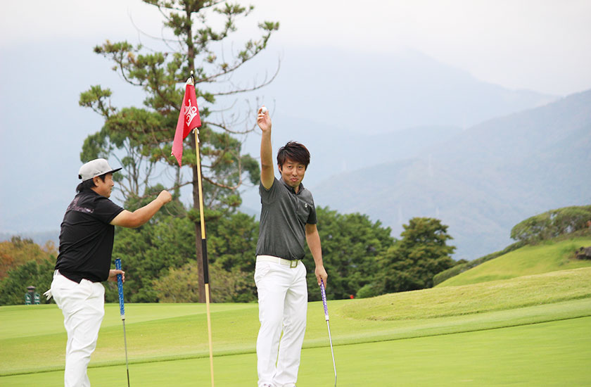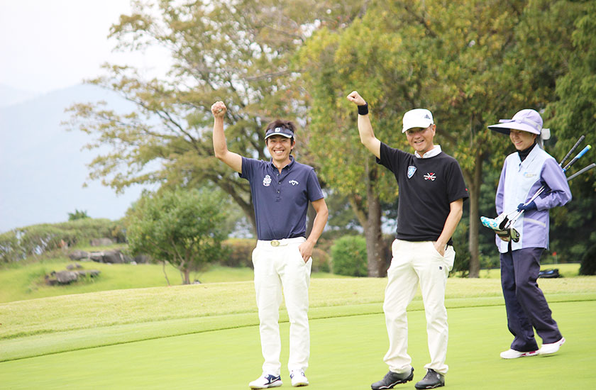 中里朋晶選手、神尾秀久選手のペア「ゴッドテール」のお二人。残り120ヤードを中里選手がピッチングウェッジでピン左約4メートルにつけ、神尾選手が有終の美を飾るバーディーで締め括りました。