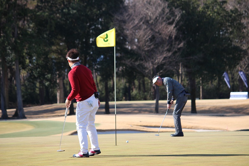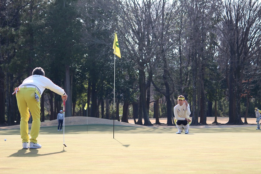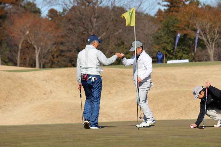 残念ながらバーディパットは外してしまいましたが、笑顔のVサインでホールアウトしたのは「KAMOファミリー」の真家智行選手と鴨志田義明選手。