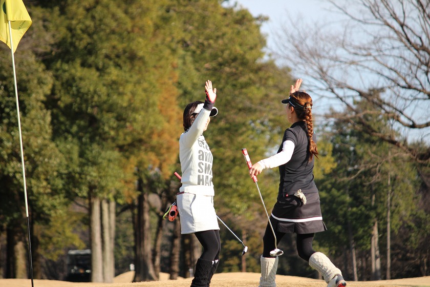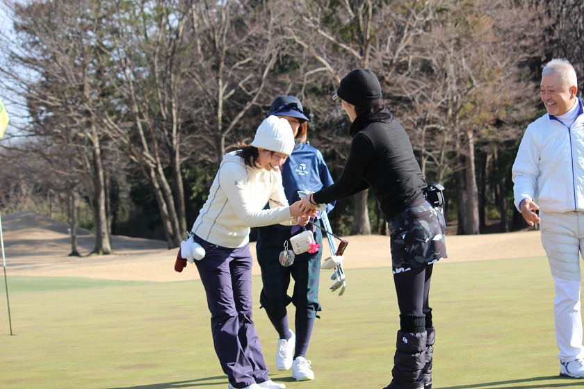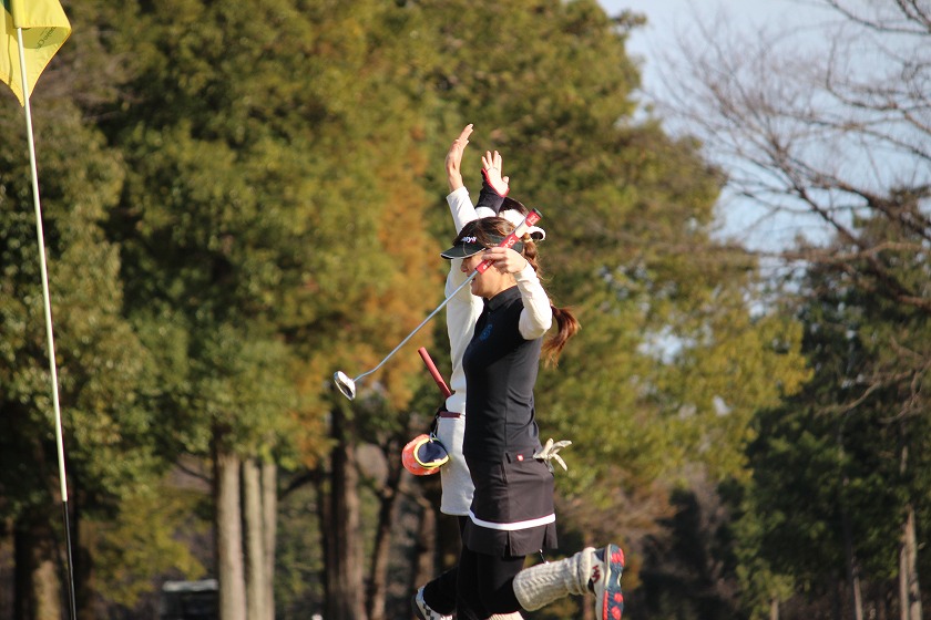 そして何と! これまた「2年2組」の長浜真由美選手も決めてみせた! パートナーの三上選手と微笑ましいグータッチ。両組共に固い握手を交わしてのホールアウトとなりました。