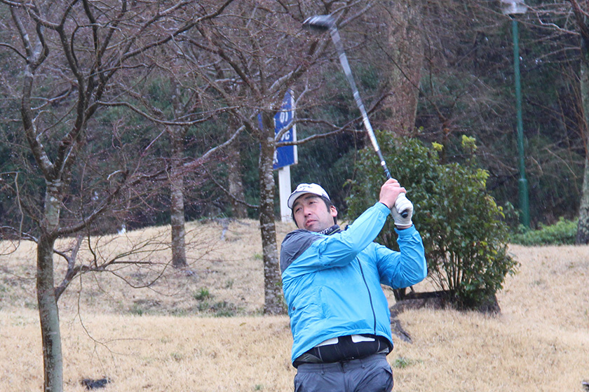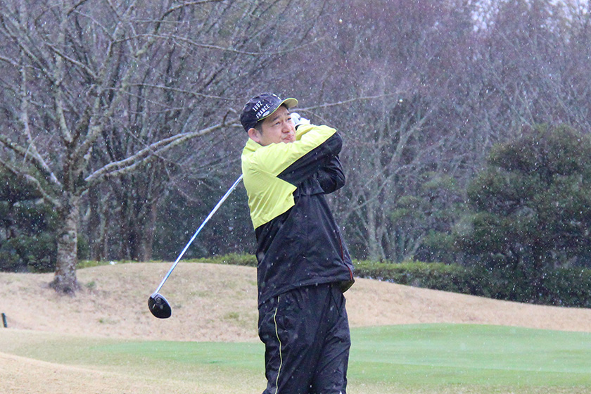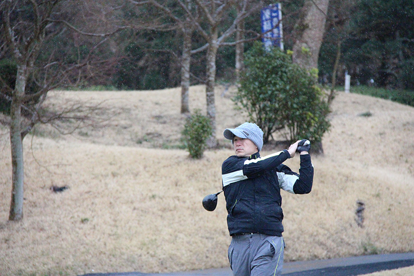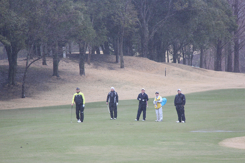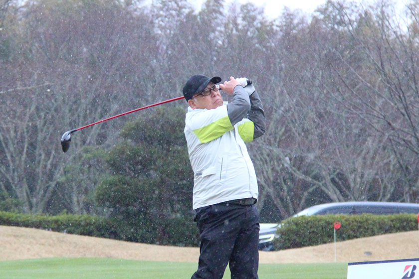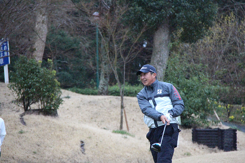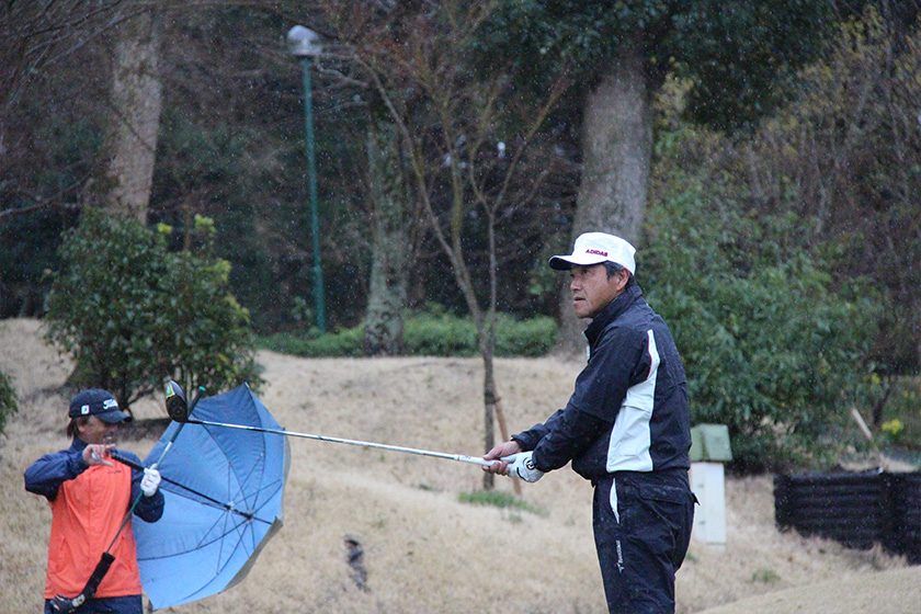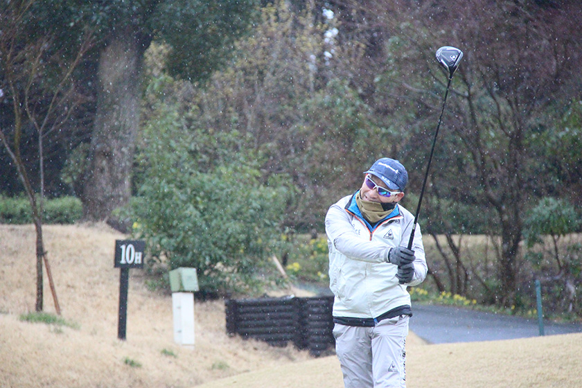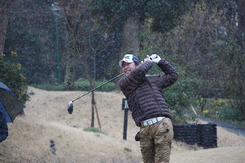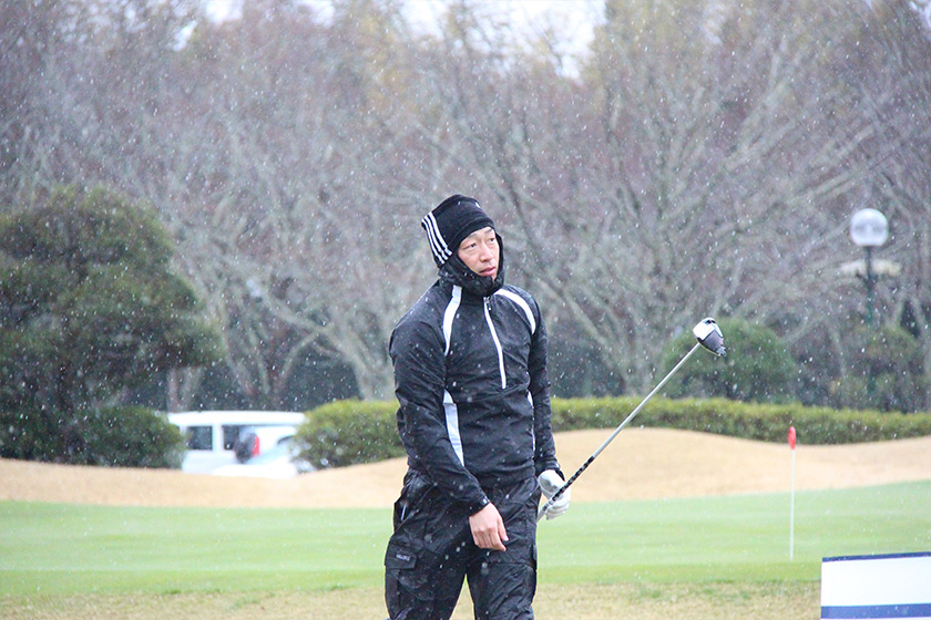 この寒さの中、さすがにお一人はレインウェアを着込んでいらっしゃいましたが、前半2バーディ、ノーボギーの34をマーク。まずまずのスコアで後半へターンしていきました。