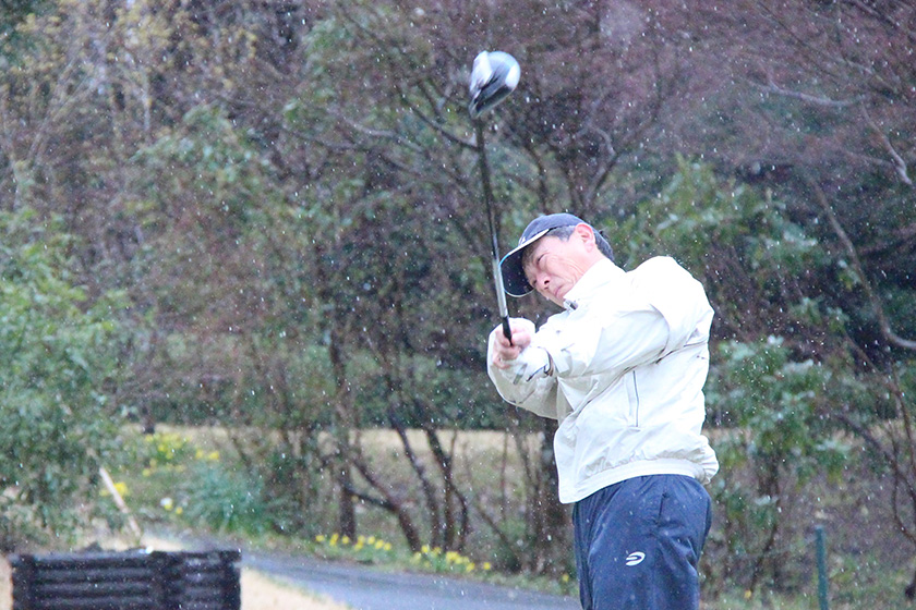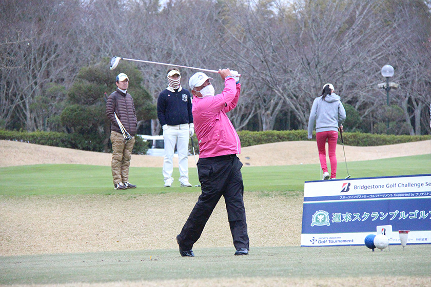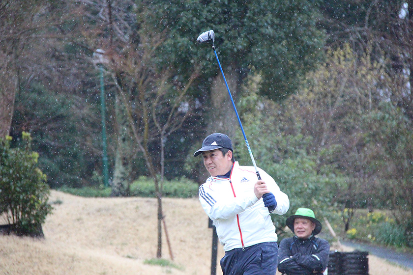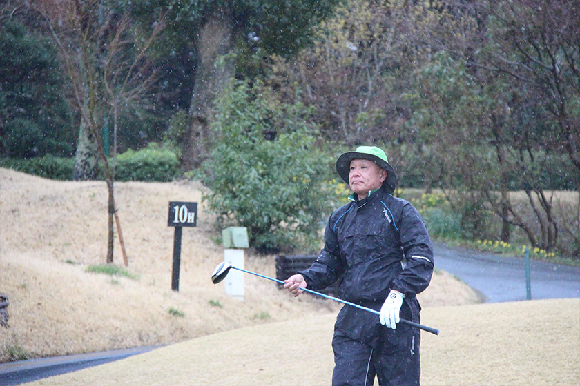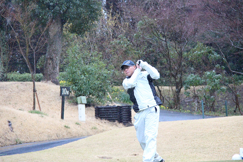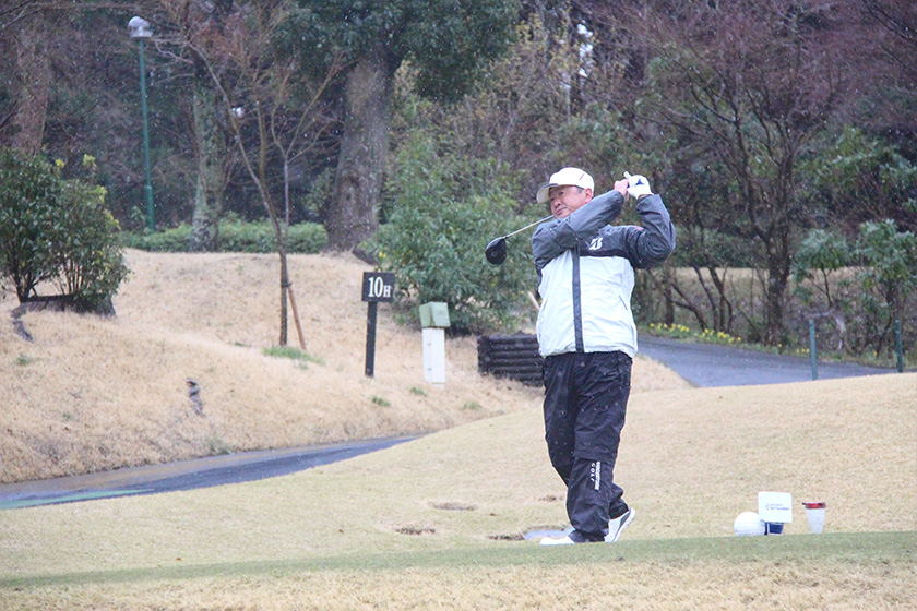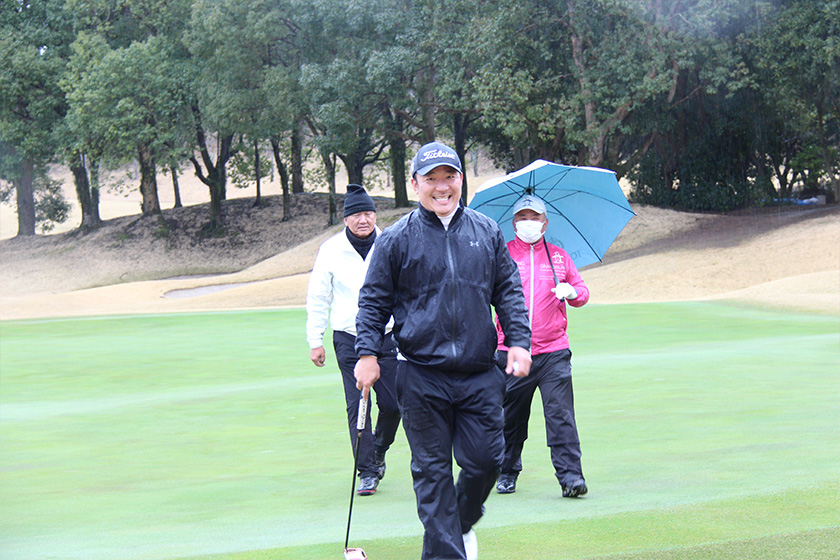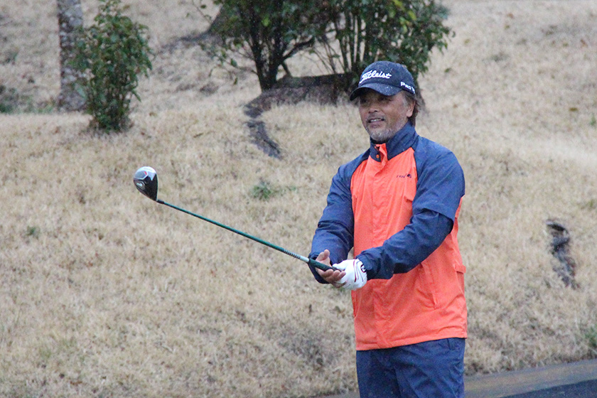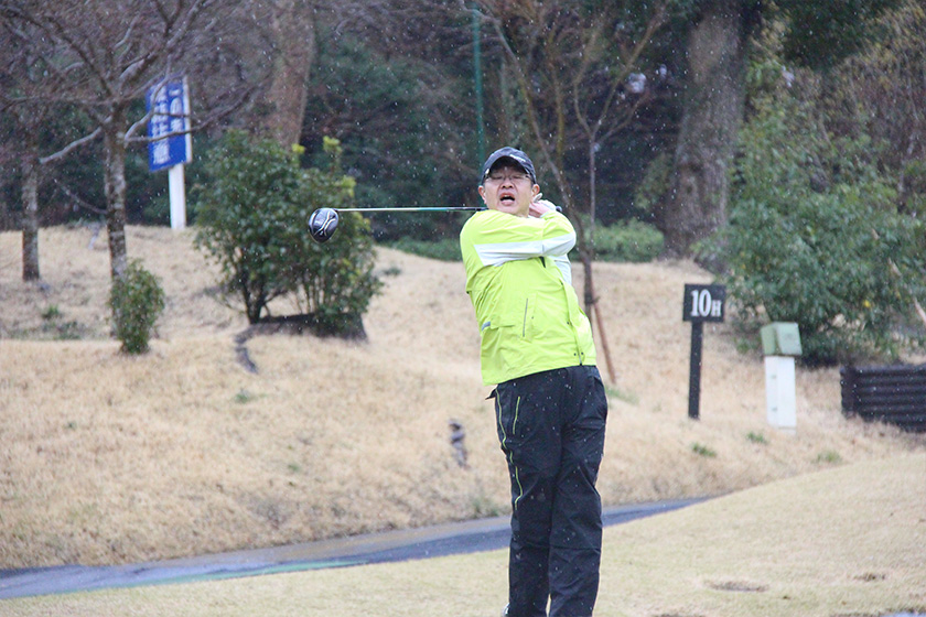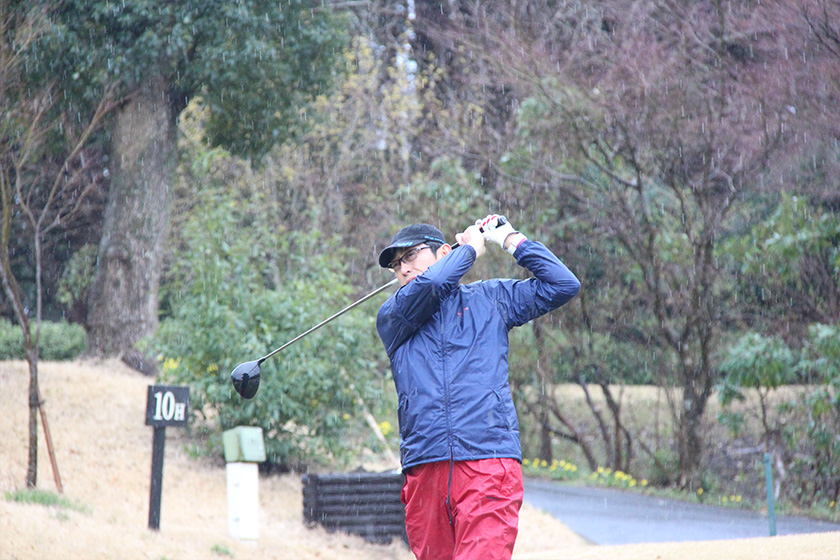 この寒さの中、さすがにお一人はレインウェアを着込んでいらっしゃいましたが、前半2バーディ、ノーボギーの34をマーク。まずまずのスコアで後半へターンしていきました。