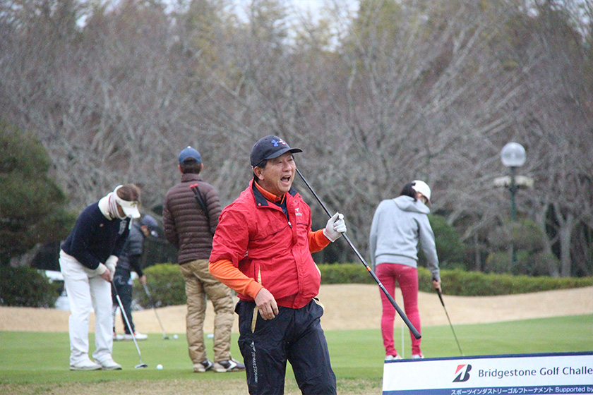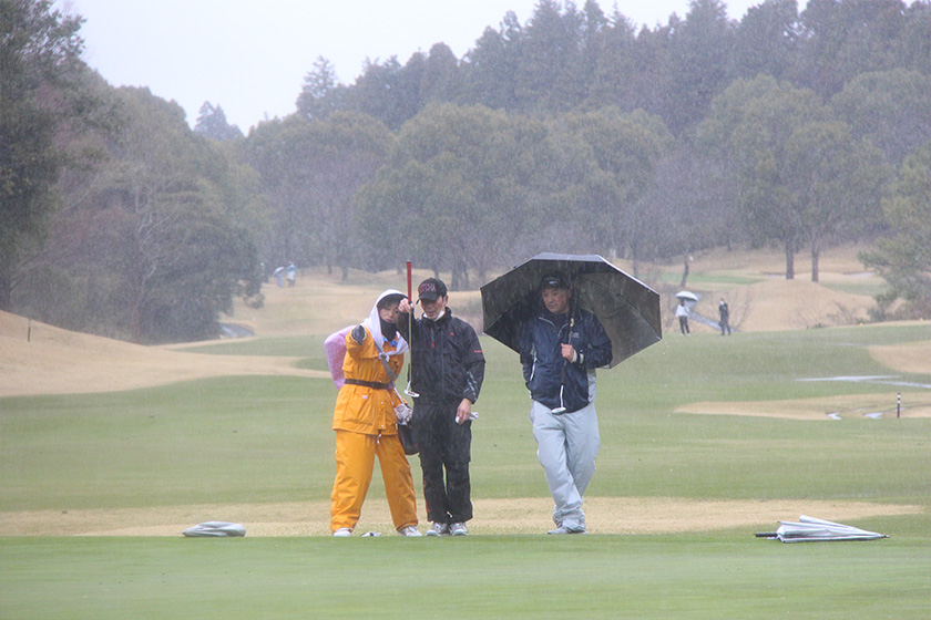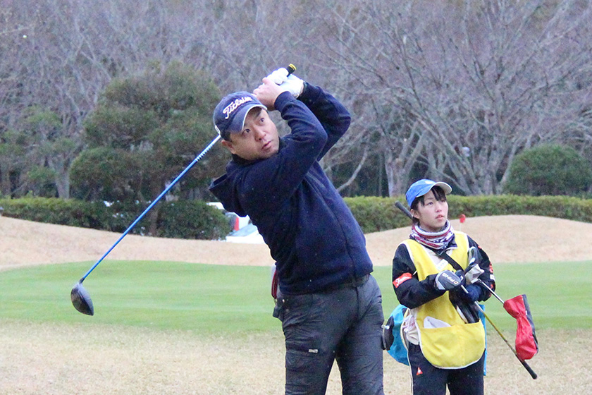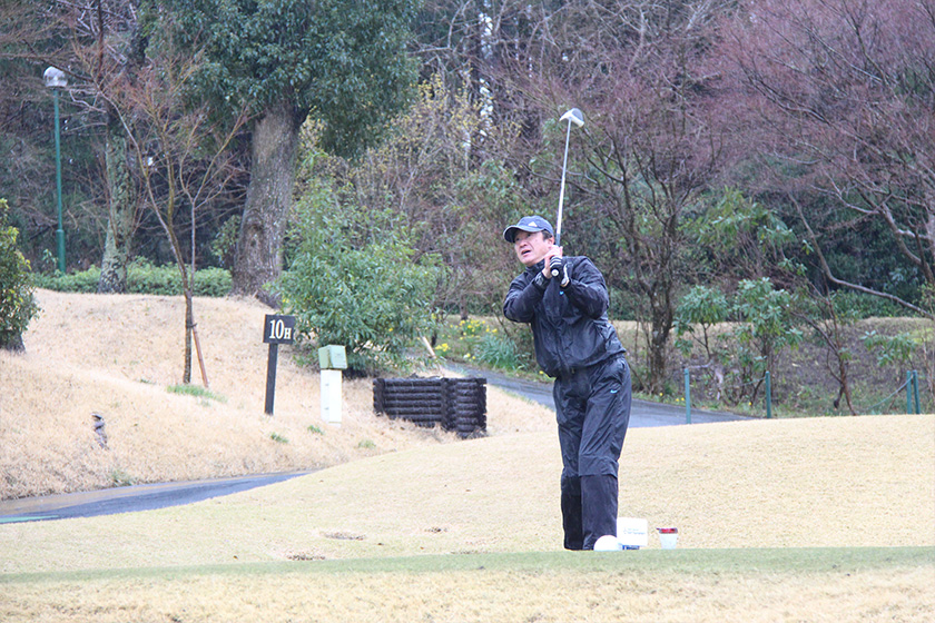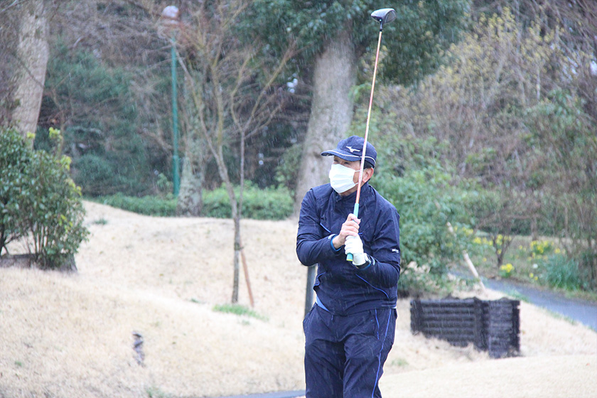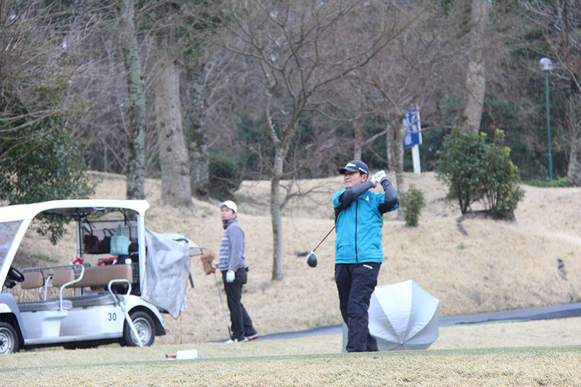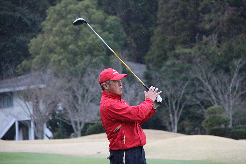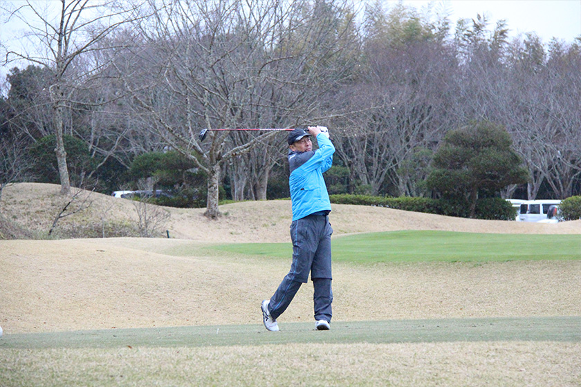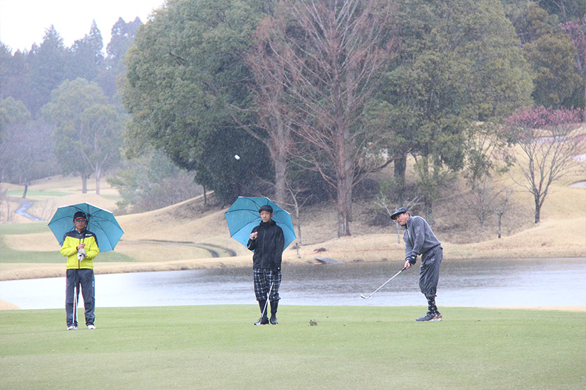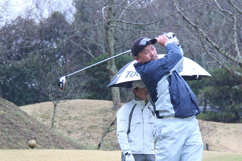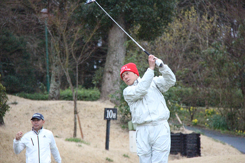 この寒さの中、さすがにお一人はレインウェアを着込んでいらっしゃいましたが、前半2バーディ、ノーボギーの34をマーク。まずまずのスコアで後半へターンしていきました。