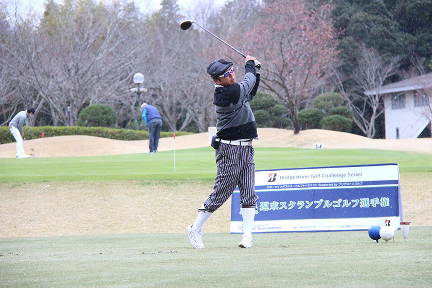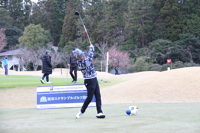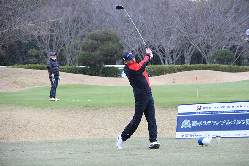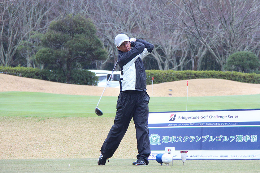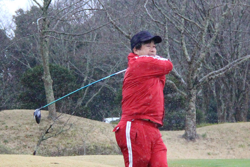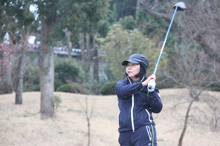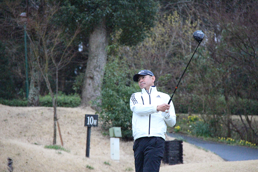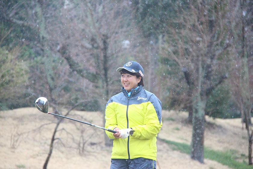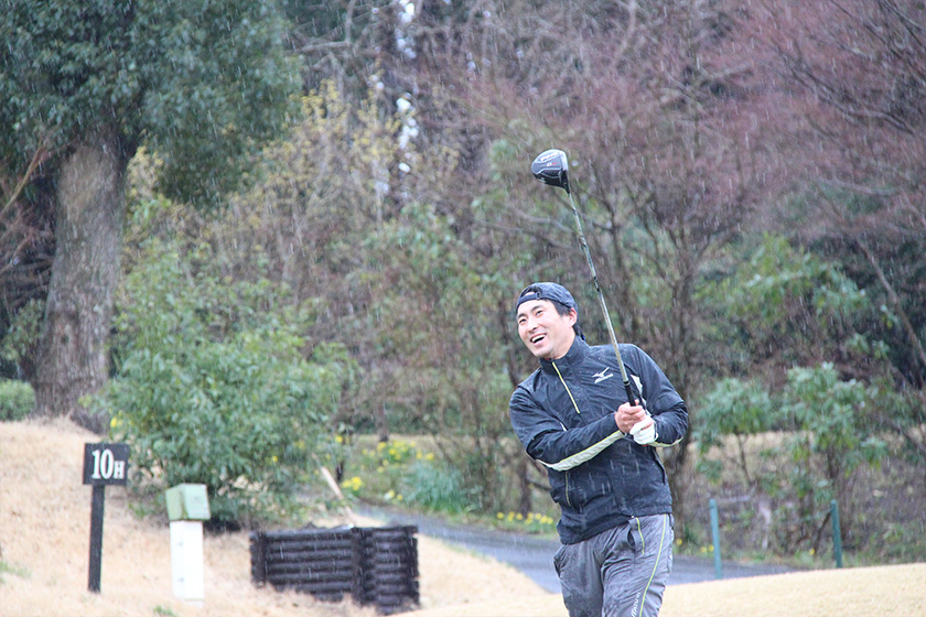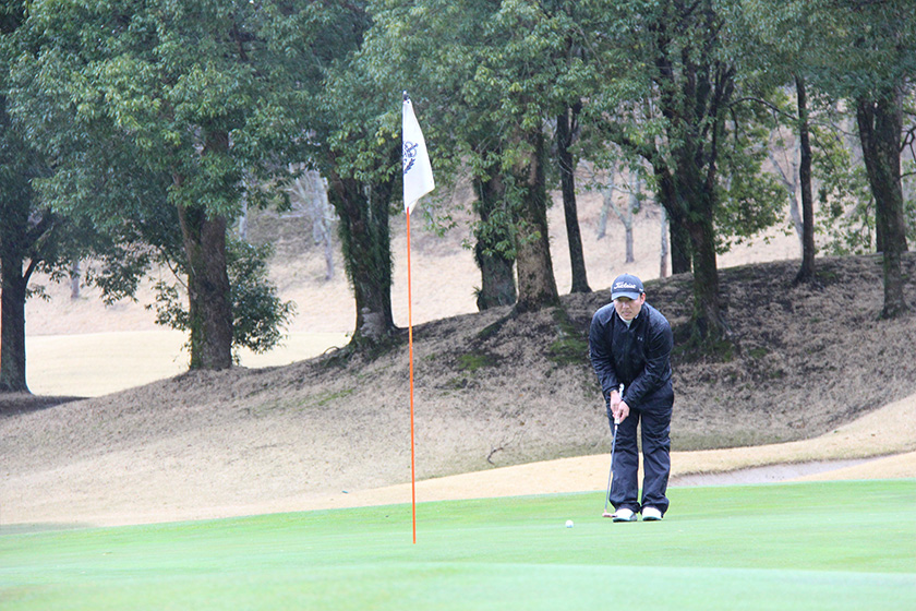 この寒さの中、さすがにお一人はレインウェアを着込んでいらっしゃいましたが、前半2バーディ、ノーボギーの34をマーク。まずまずのスコアで後半へターンしていきました。