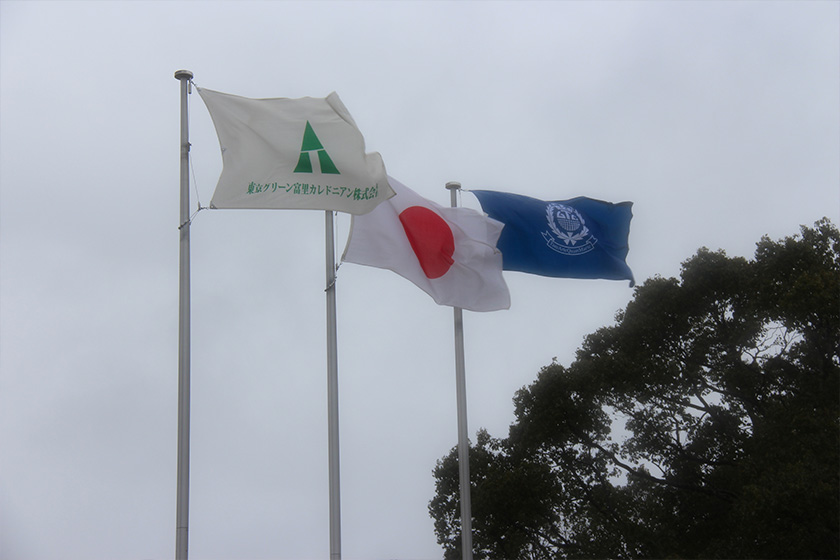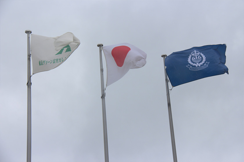 午後に入っても雨風は一向に収まる気配はなく、むしろ強さを増すばかり。今にも引きちぎれんばかりの勢いでなびくクラブハウス前の旗をご覧ください。選手の皆さんがどれだけ厳しい天候の中で頑張っていたか、証拠写真を貼り付けておきます(笑)