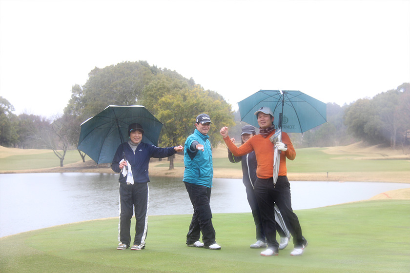「この雨の中でもグリーンは速くて難しかったけど、パーオンしなかったホールは1つだけ。うまく噛み合った」という言葉どおり、6バーディ・ノーボギーの完璧な内容。千葉県内のメンバーシップゴルフクラブの仲間という4名は、キャプテンの水野選手以外、初めての出場というチーム。そんな中、「雨の中で耐えるゴルフは慣れている。得意!」と胸を張る武田選手のプレーがスコアを作る上で軸となったようです。おめでとうございました!