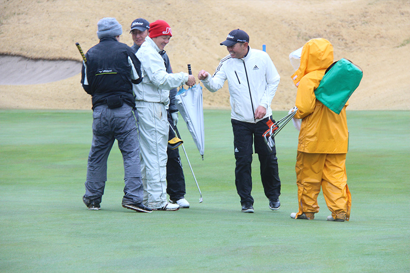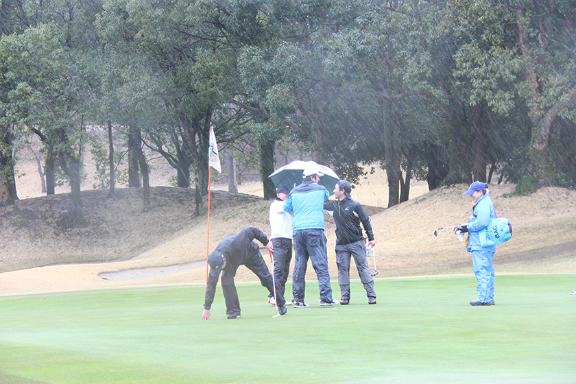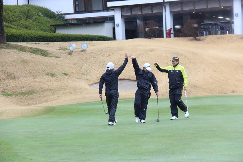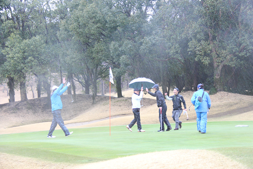しっかり決めてナイスバーディ! いやぁ、雨風をものともしないスーパーショットの競演に、俄然盛り上がりを見せる週末スクランブルゴルフ選手権 チーム戦決勝大会。悪天候の中でも、4人力を合わせてバーディを狙う。これぞチーム戦の醍醐味ですね!