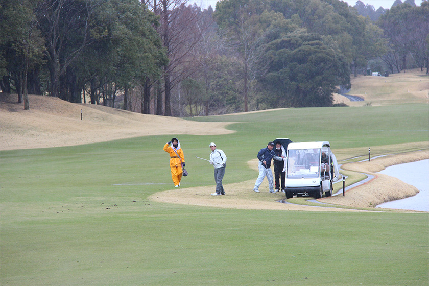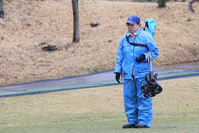 キャディさんも完全防備でスタンバイ。皆さんのプレーを見守っています。ご苦労様です!