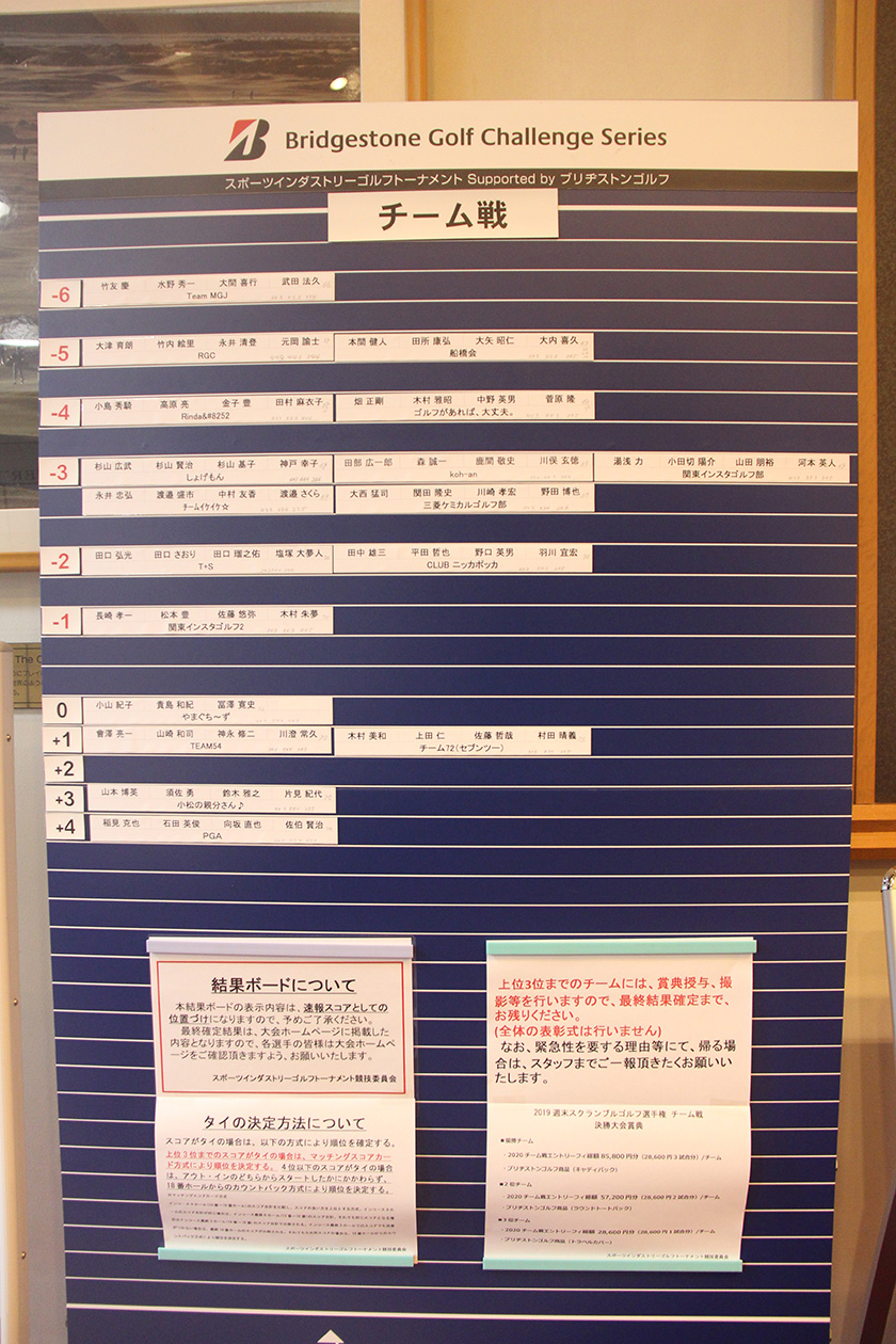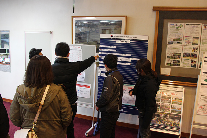 クラブハウス内、スコアボードの前には最終成績の発表を今か今かと待ちわびる選手とギャラリーが集まっています。果たして、優勝はどのチームか……